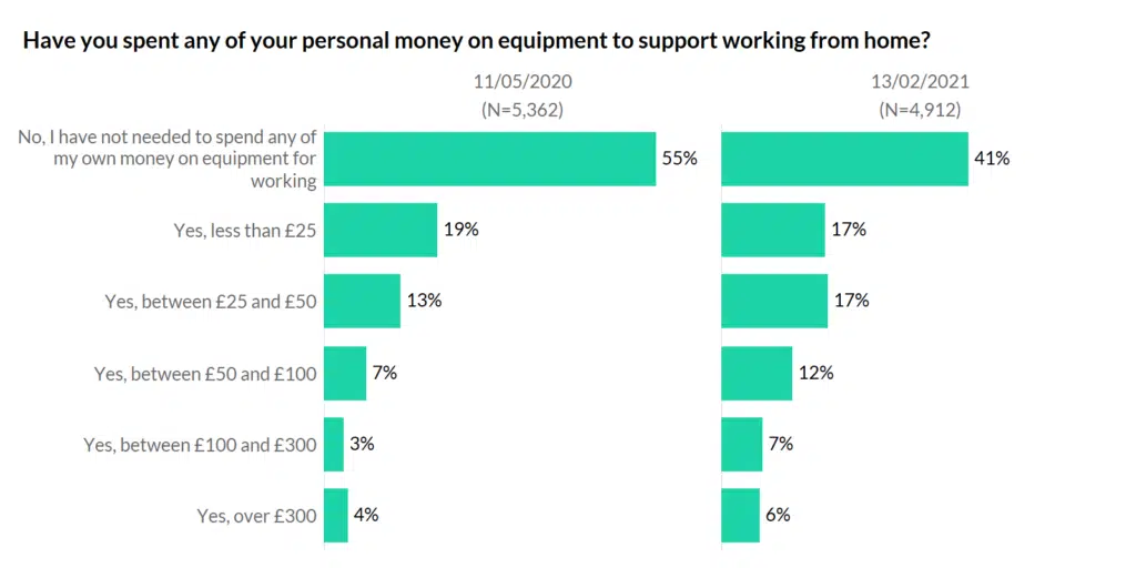 Delivering lessons while sitting wedged under the stairs with a laptop rested on plastic crates can only last so long! Hence, more of you now say that you’ve spent personal money on equipment to support your working from home – with 1 in 20 of you spending more than £300. (We hope you’ve got a winning set up!)