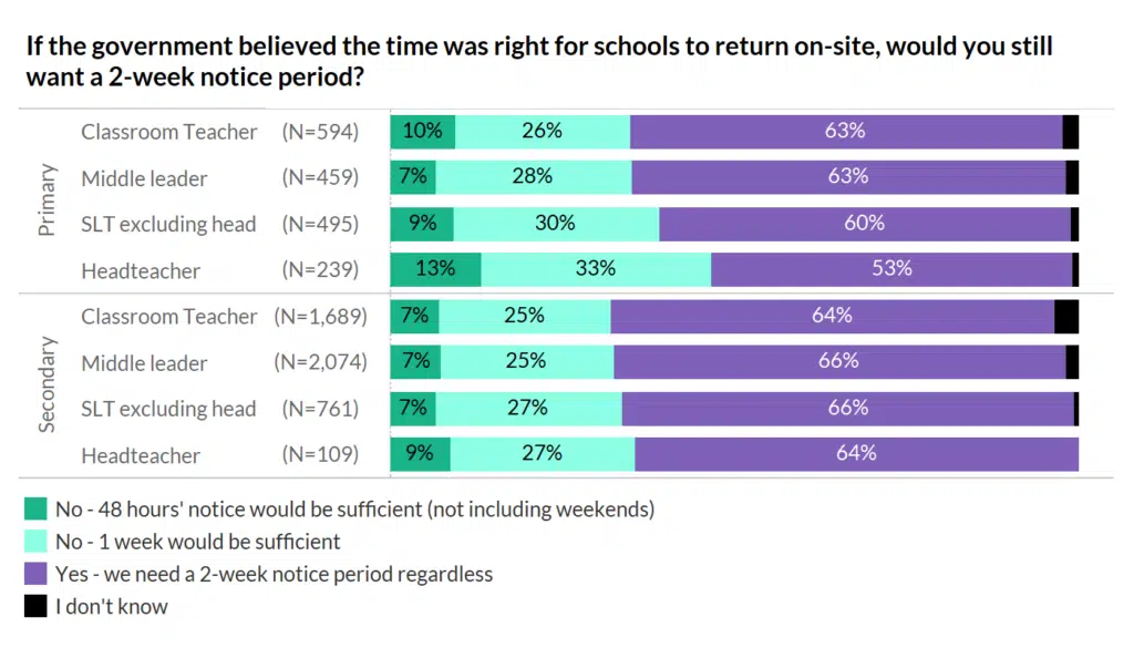 Regardless of the stats, most of you felt that a 2-week notice period was needed. Headteachers were the most flexible, with 13% of primary heads saying they would need just 48 hours’ notice. Overall, however, the government would be wise to stick to its word and give at least a 2-week heads up!