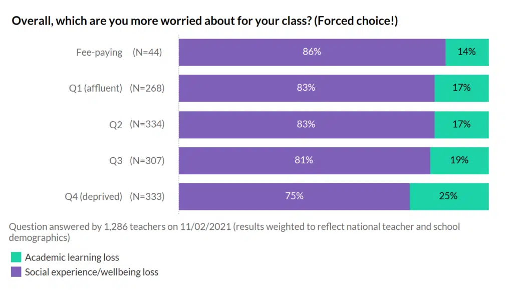 Primary teachers agreed, with 80% saying their biggest worry for their class was the loss of social experiences and wellbeing. Teachers in poorer areas were slightly more worried about academic learning loss, but they were still a minority.