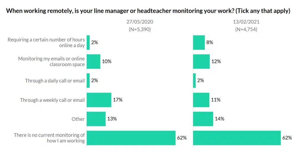 When working remotely we can see more teachers are required to be online for a certain number of hours per day, but it’s still just 8% of you. Few senior leaders are monitoring emails or online classroom spaces (12%) and there’s less chasing of staff via weekly calls or emails.