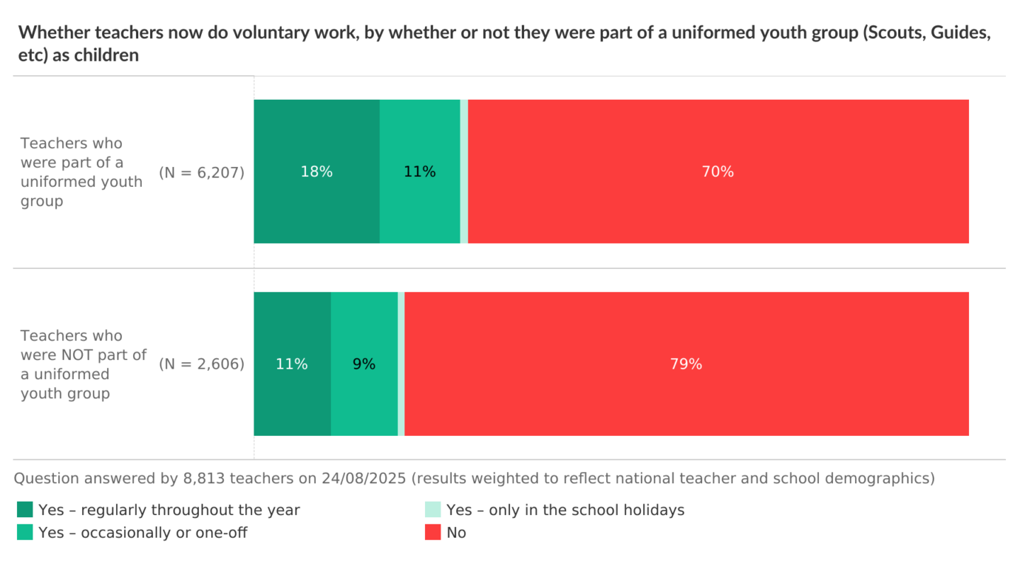It also turns out that 70% of teachers were in a uniformed youth group as children. But does that early experience make a difference later in life? The answer seems to be yes: teachers who were in youth groups are more likely to volunteer regularly as adults (18%) compared to those who weren’t (11%).