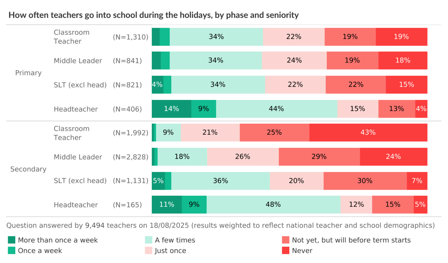 How often teachers go into school seems to depend on both seniority and phase. 14% of primary headteachers told us they’ve been going in more than once a week (compared to 11% of secondary heads). Meanwhile, primary classroom teachers are much more likely than secondary classroom teachers to report going in “a few times” (34% vs 9%).