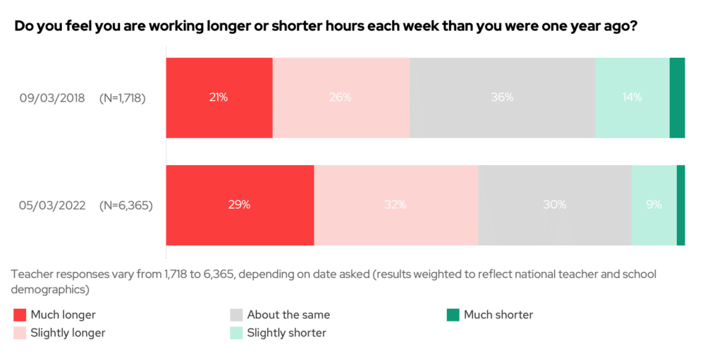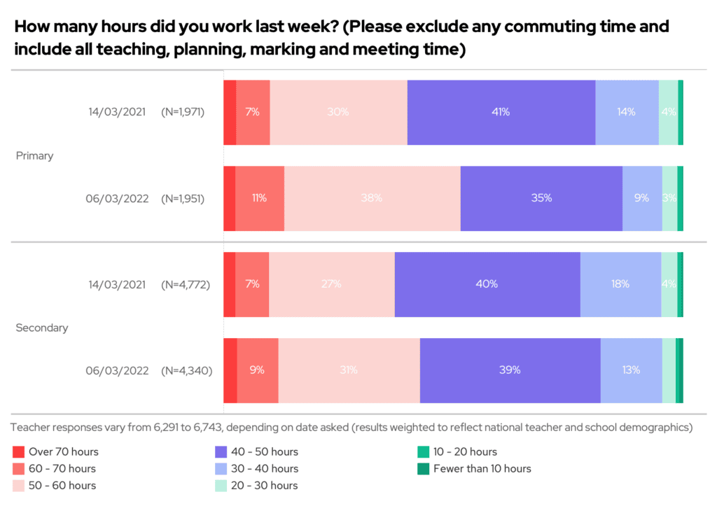 Is it the case that teachers are actually working longer hours than they were a year ago, though, or is this just a feeling, given everything else going on in the world? Well, let’s crack out our archive to see!