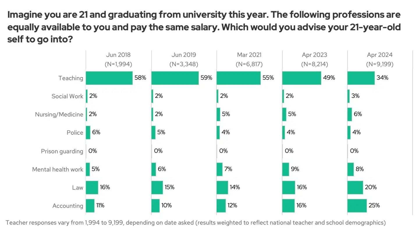 Those who are least likely to revisit teaching were those with the most experience. Just 31% of teachers with 20 or more years’ experience opted to advise teaching again.