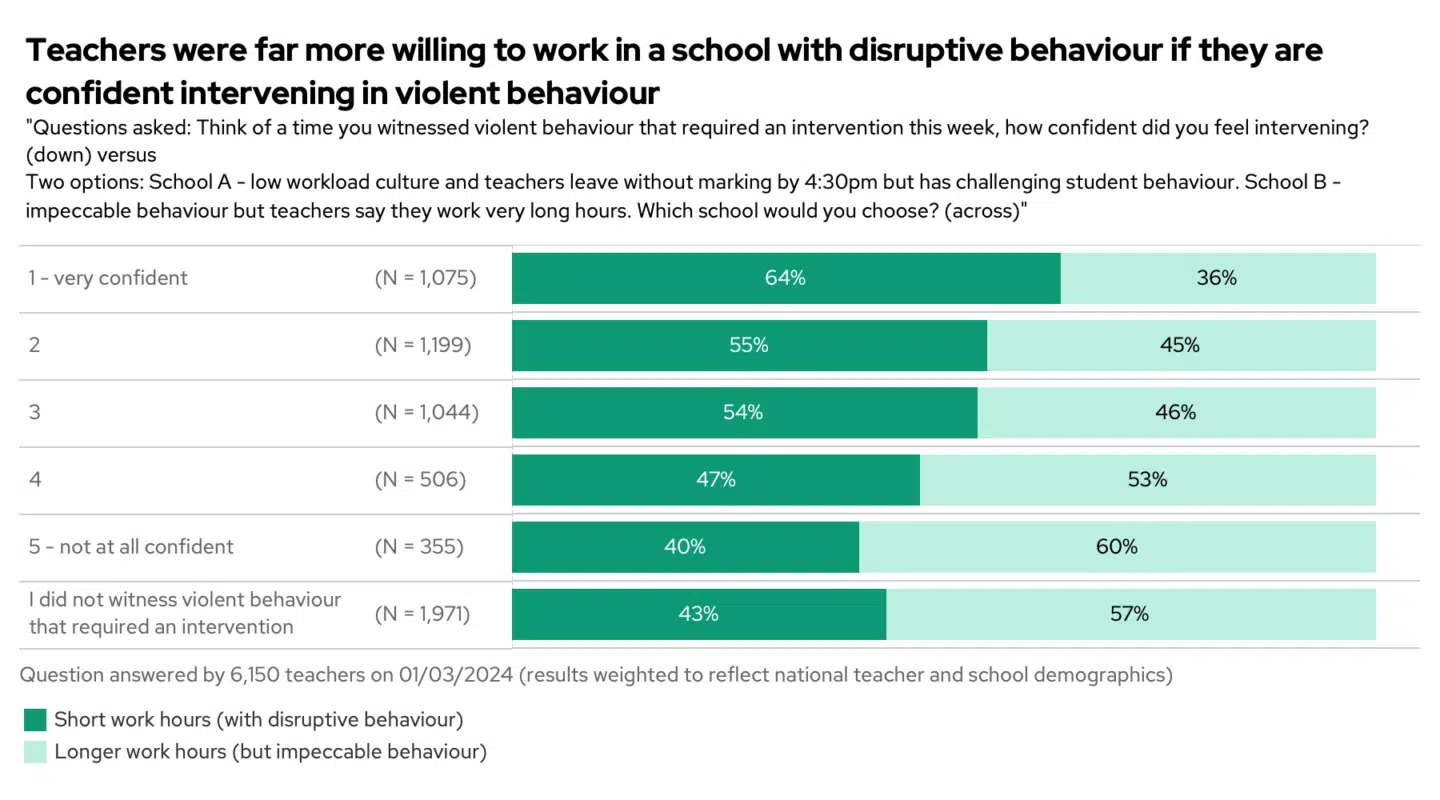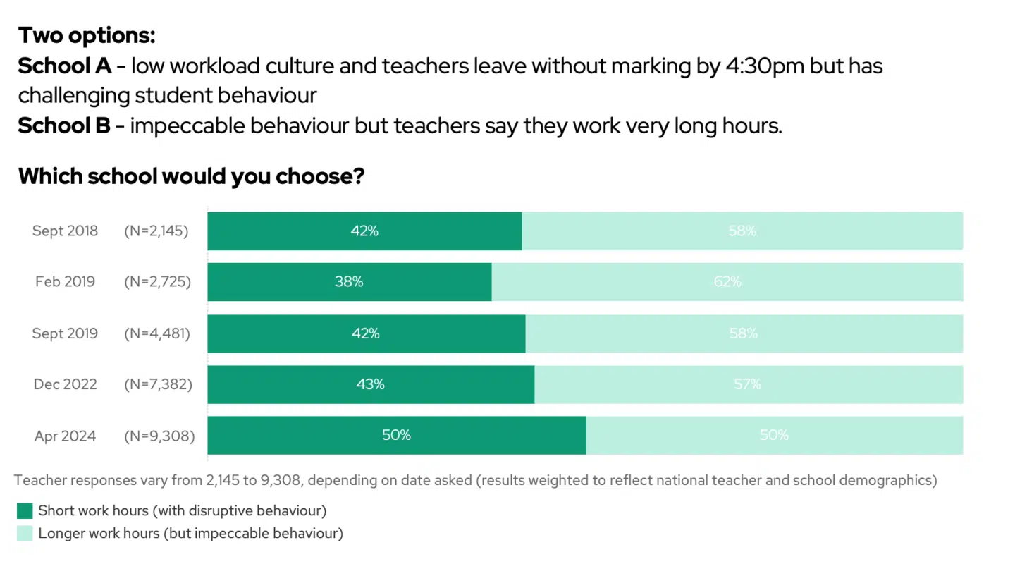Despite your calls that behaviour is worsening, an increasing percentage of you would prefer the school with challenging student behaviour but shorter work hours. But why?