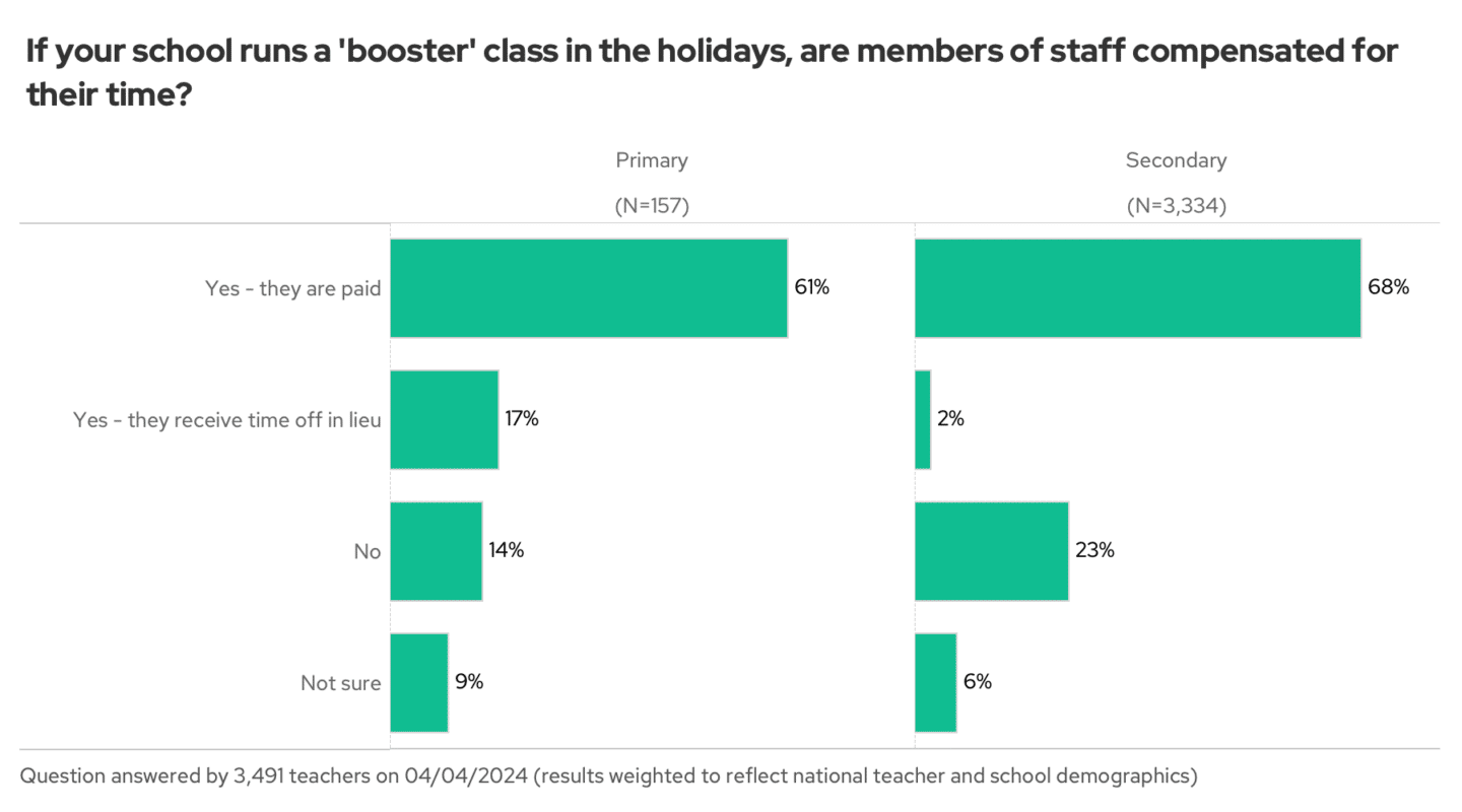 Indeed, 61% of secondary teachers say their school is hosting such sessions at some point in the Easter holiday. The same is true of just 6% of primary schools. This is about the same as last year for both phases.