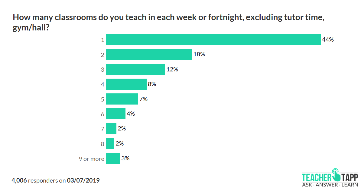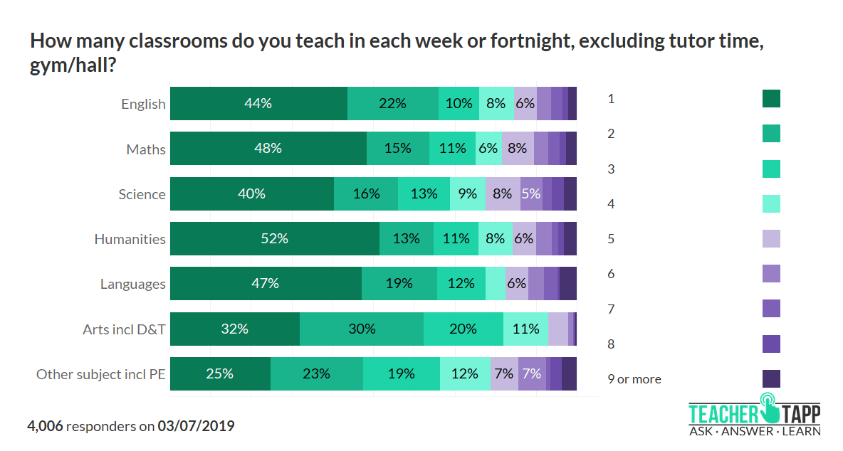 Those of you teaching in minority subjects are most likely to be using multiple classrooms. If it is because you are using specialist equipment in each one then that makes sense. But for others, it is simply because you are a ‘small’ subject who doesn’t get to have a dedicated corridor of rooms.