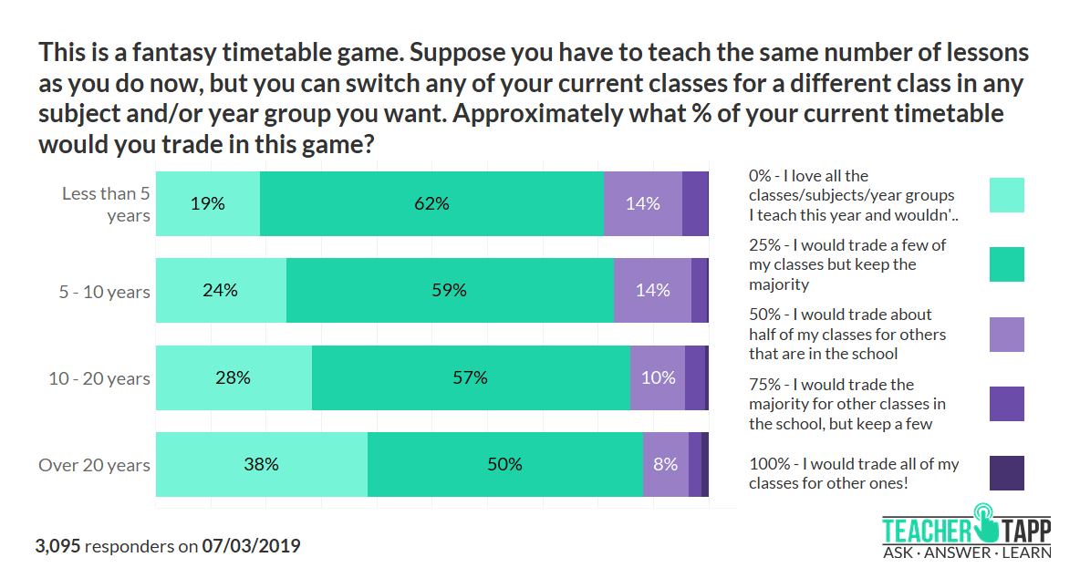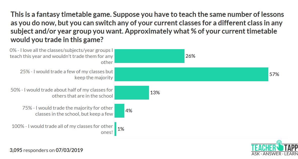 But do you remember being asked what your ideal year group would be back in April? At the time, 63% said that your current year group is your ideal year group. Did the rest of you get your wish come true for next year? No! Just 8% of teachers had their wish come true this summer, i.e. they previously weren’t teaching their ideal year group but were allocated it this time round. Worse, 15% of teachers have had their dreams dashed, e.g. they said they were teaching your idea year group have now been moved to another year group!!!