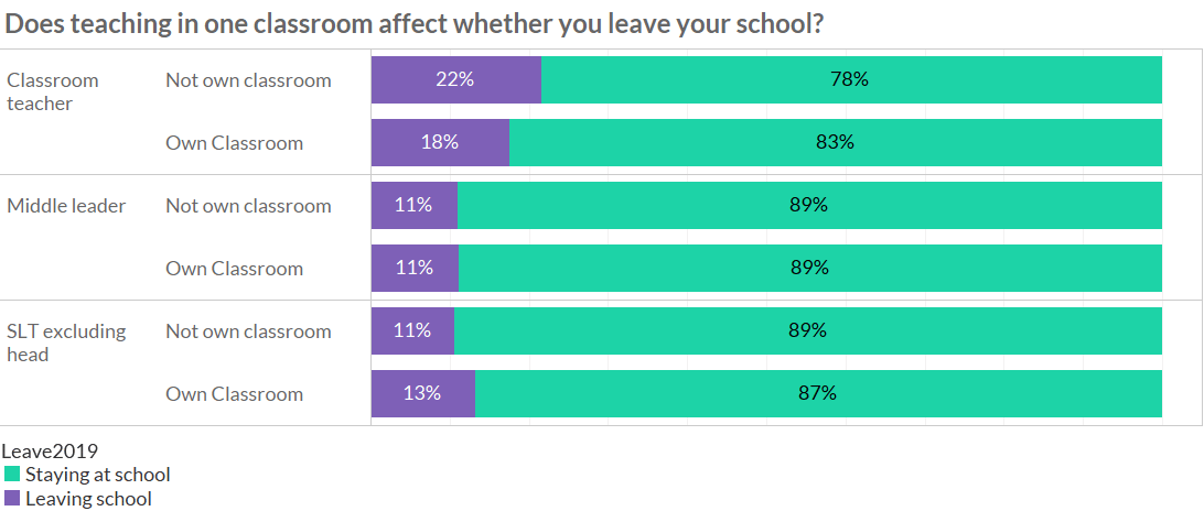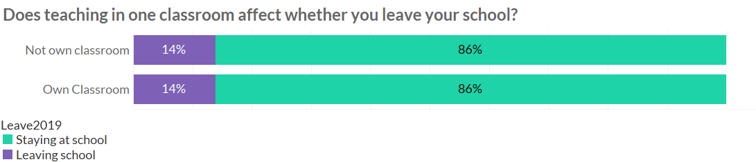 Here we find that 22% of classroom teachers without their own classroom are leaving at the end of the year, compared to 18% who do have their own classroom. The differences isn’t huge – unfortunately it isn’t big enough for us to be sure that teaching across multiple classrooms contributes to the decision to leave.