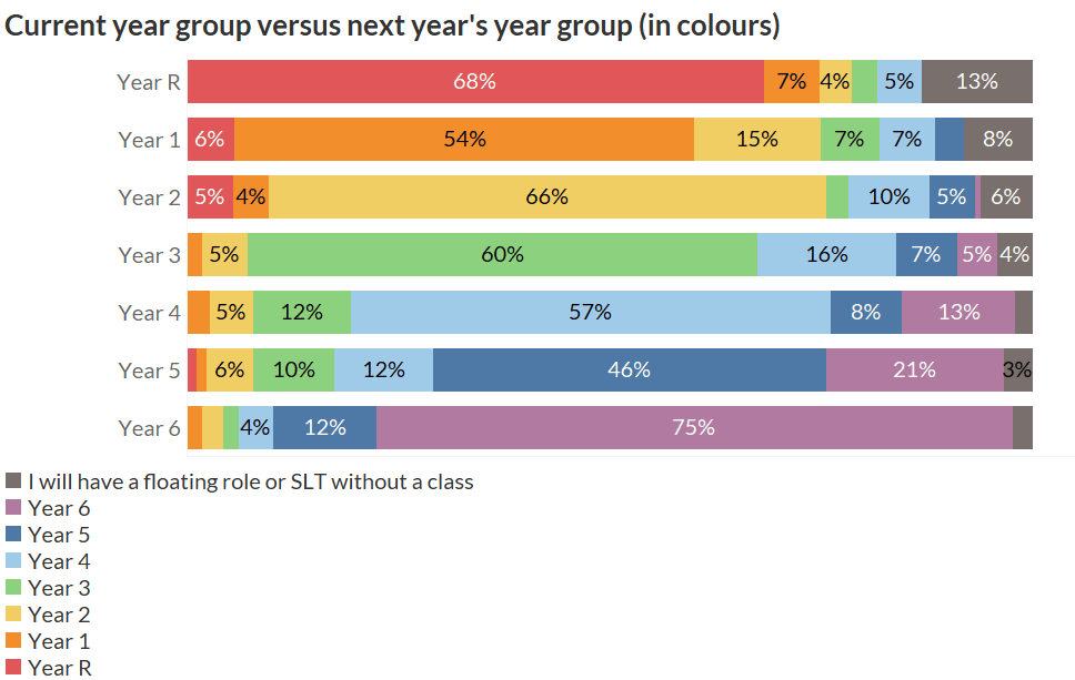 Once again we learned that Reception and Year 6 teachers are most likely to stay where they are. Year 5 teachers are most likely to be moving.