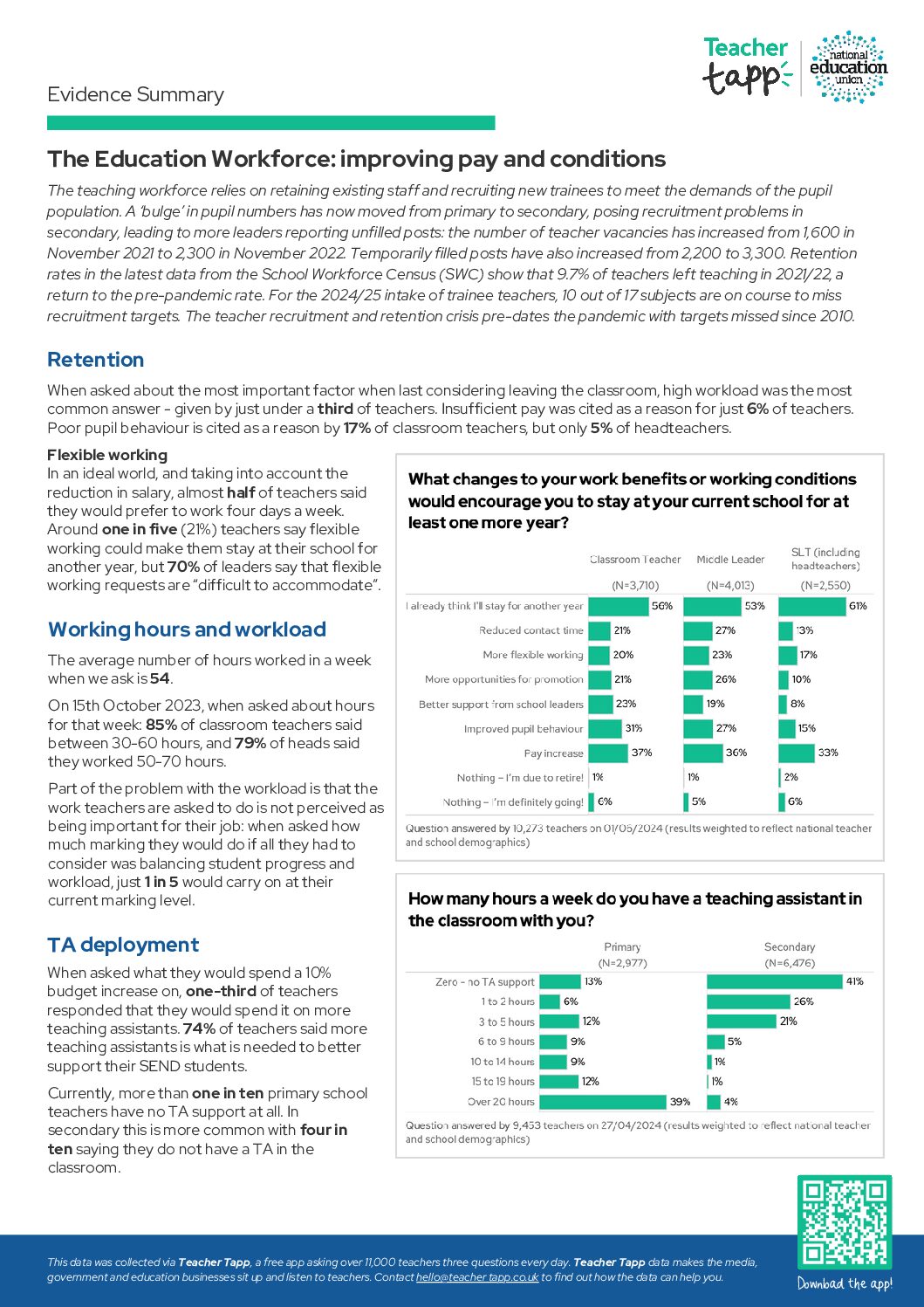 The teaching workforce relies on retaining existing staff and recruiting new trainees to meet the demands of the pupil population. A ‘bulge’ in pupil numbers has now moved from primary to secondary, posing recruitment problems in secondary, leading to more leaders reporting unfilled posts: the number of teacher vacancies has increased from 1,600 in November 2021 to 2,300 in November 2022. Temporarily filled posts have also increased from 2,200 to 3,300. Retention rates in the latest data from the School Workforce Census (SWC) show that 9.7% of teachers left teaching in 2021/22, a return to the pre-pandemic rate. For the 2024/25 intake of trainee teachers, 10 out of 17 subjects are on course to miss recruitment targets. The teacher recruitment and retention crisis pre-dates the pandemic with targets missed since 2010.