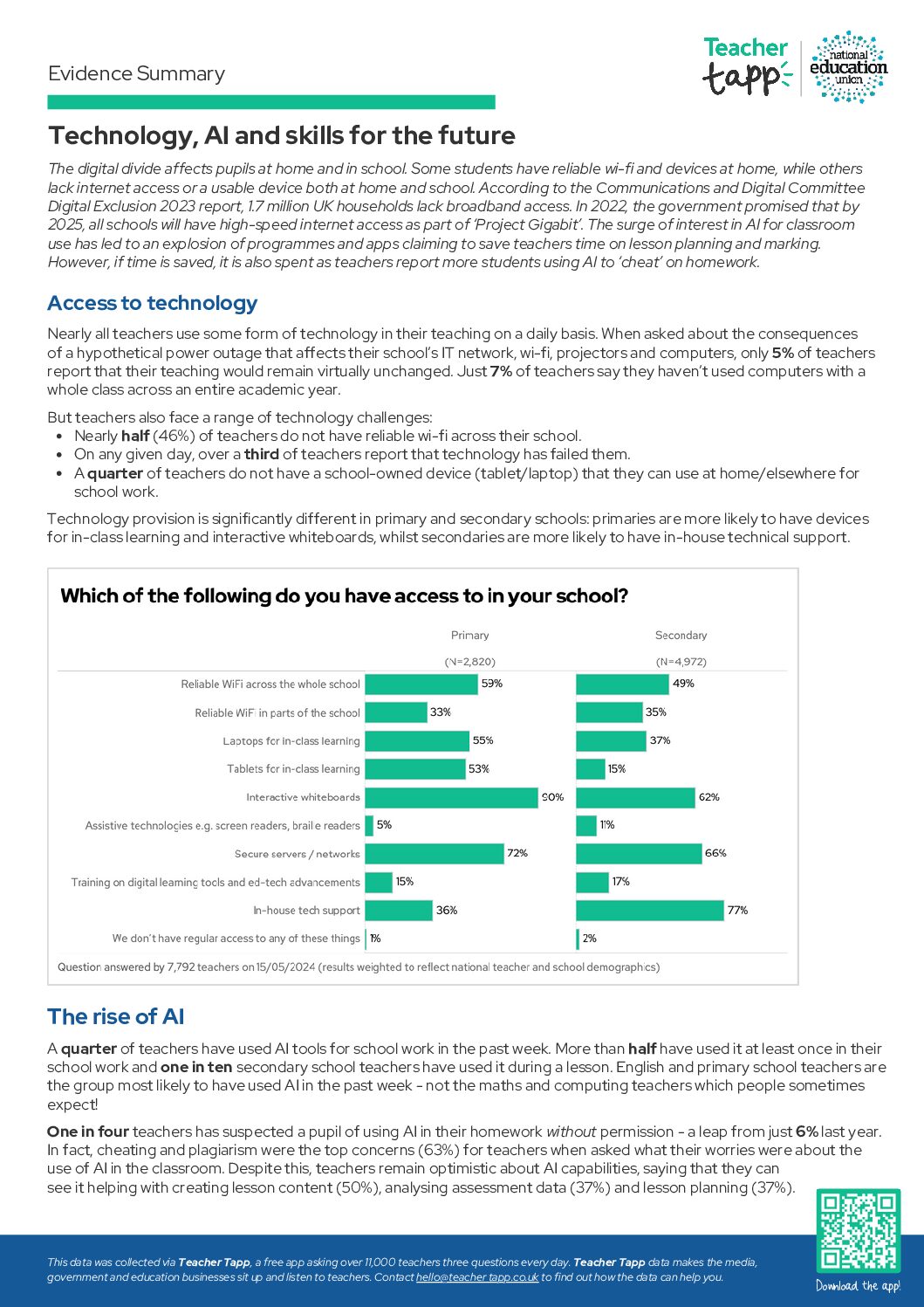 The digital divide affects pupils at home and in school. Some students have reliable wi-fi and devices at home, while others lack internet access or a usable device both at home and school. According to the Communications and Digital Committee Digital Exclusion 2023 report, 1.7 million UK households lack broadband access. In 2022, the government promised that by 2025, all schools will have high-speed internet access as part of ‘Project Gigabit’. The surge of interest in AI for classroom use has led to an explosion of programmes and apps claiming to save teachers time on lesson planning and marking. However, if time is saved, it is also spent as teachers report more students using AI to ‘cheat’ on homework.