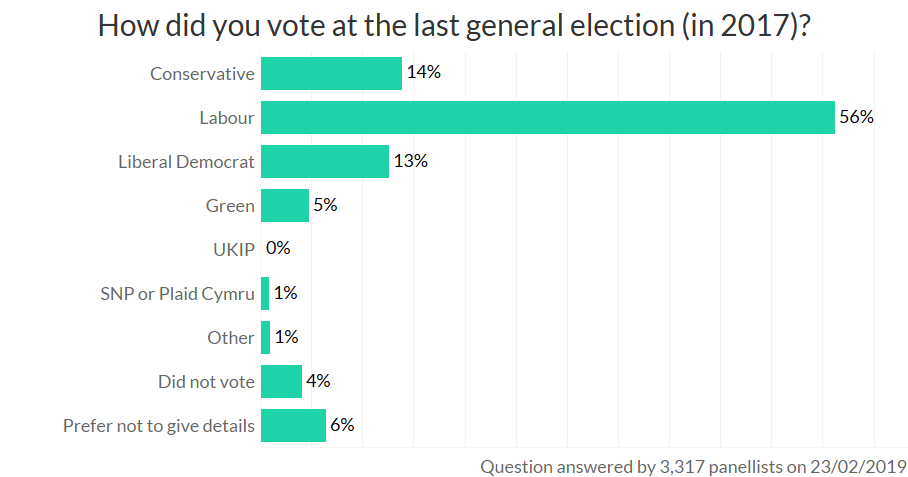 This week, our cohort was bigger (3,317) and slightly less likely to say they voted Labour back in 2017 – but the reds were still way ahead.