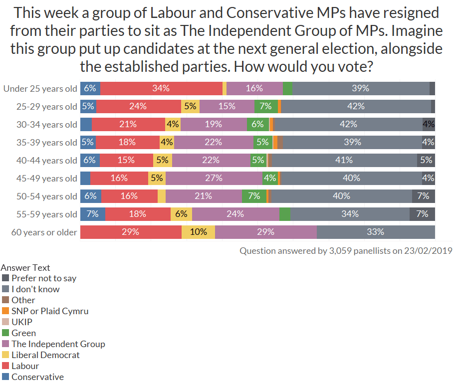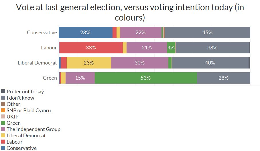 The ‘I Don’t Know’ group is also large. And they are important. Political polls often have a large group in this category. In the past, most have gone back to the party that they previously voted for, and so pollsters often build this into their predictive models. Of those who voted Conservative last time, 45% are now Don’t Knows. Among Labour voters in 2017, 38% are now don’t know. So there’s some leeway for the Conservatives to make greater gains.
