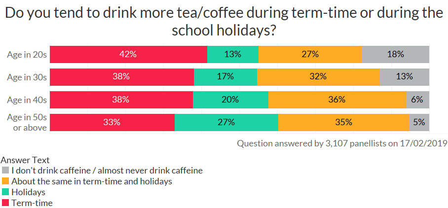 18% of teachers in their 20s don’t drink caffeine and neither do 13% of those in their 30s. (This drops to 6% once people are in their 40s).