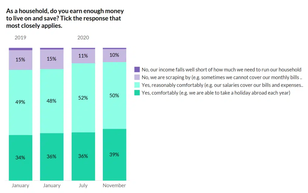 It’s also worth noting that teachers feel in a slightly better position financially as a result of events in 2020. Provided nobody in their household lost their job, the inability to go out and to holiday has positively affected household finances.