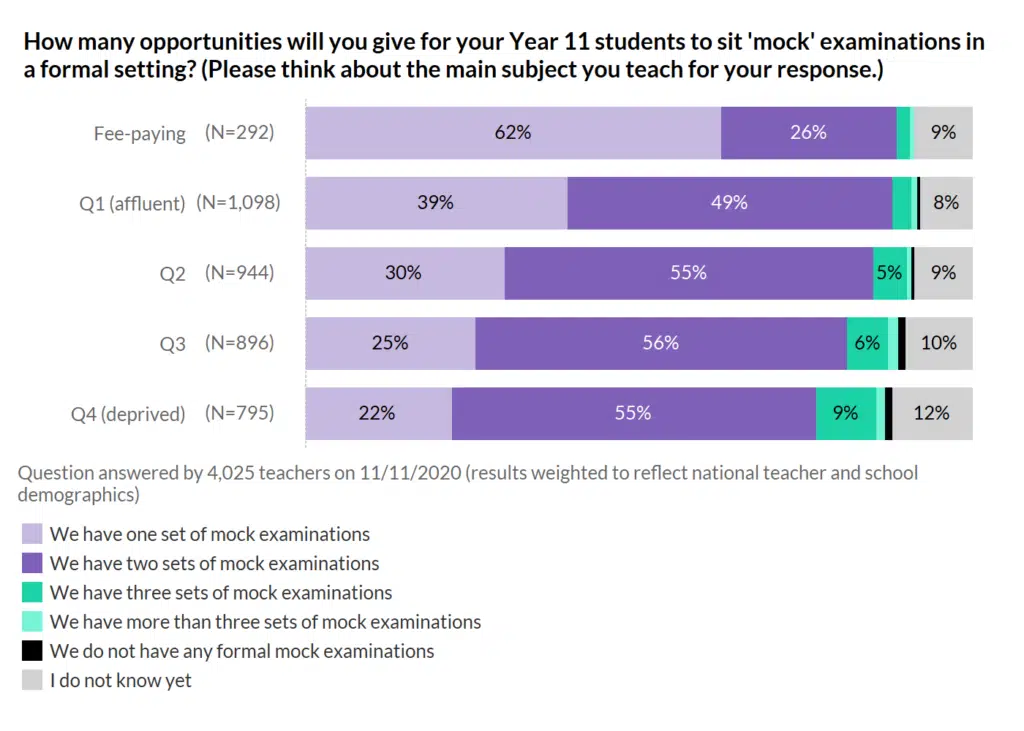 Even after lockdown ends, we still face the challenge of what to do about GCSE and A Level examinations for the current cohorts, who have had two academic years disrupted. One suggestion is to ensure ‘formal’ mock examination results are available to deal with special circumstances or absences for the main exam. However, which mock should be used? We asked how many you plan to take this year. Schools with high proportions of pupils on free meals are most likely to be taking more than one mock exam.