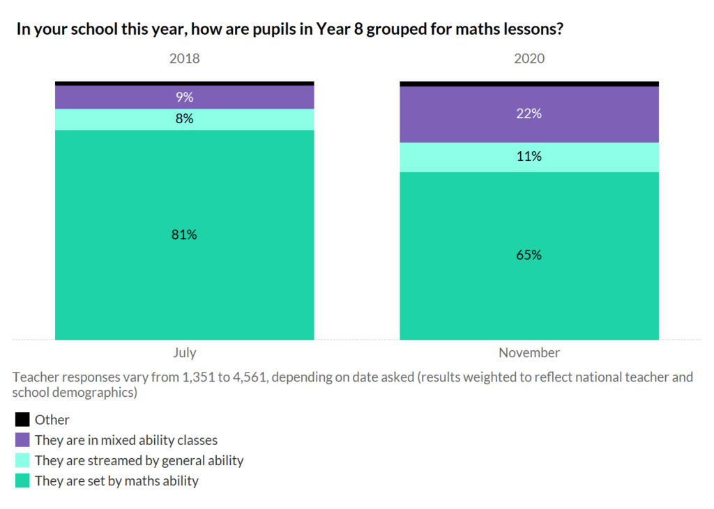 This year 22% of Year 8 students are being taught in mixed ability classes, compared to 9% in a ‘normal’ year. This is a huge challenge for maths teachers, many of whom will have taught in ability sets for their entire career so far. How are they getting on? Will this be the start of the new trend or a one-off blip?