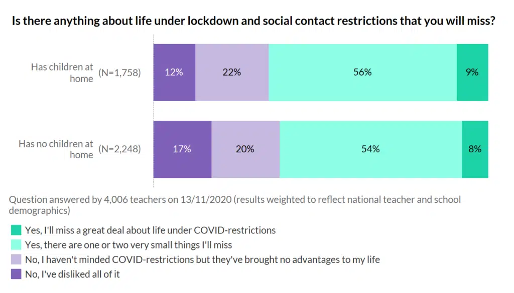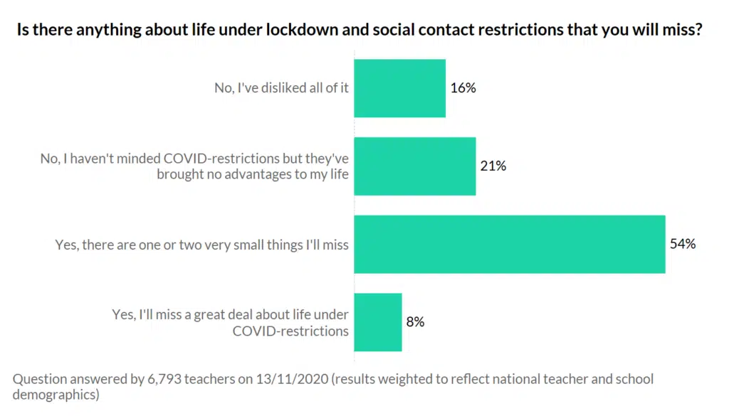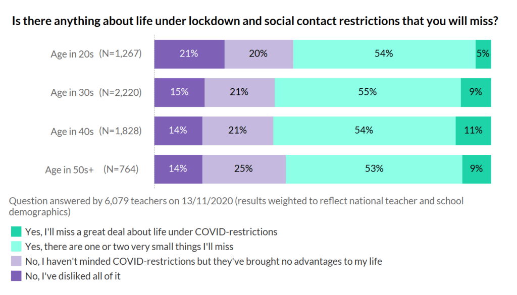 Of course, how much you’ve disliked lockdown depends on what you’ve missed! Teachers in their twenties are most likely to have disliked all of it – presumably they have missed out on more social life than the rest!