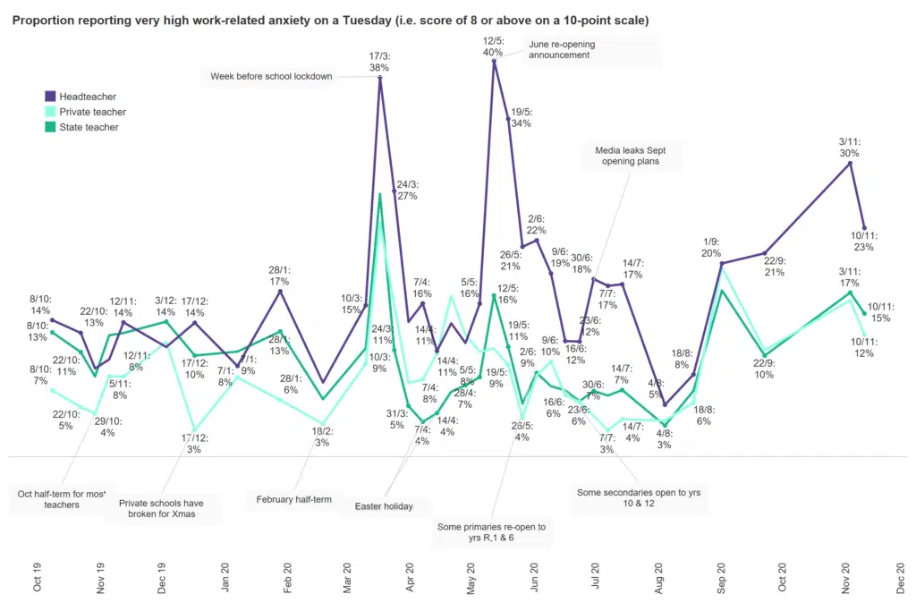 How is your anxiety this week? For classroom teachers, you’ve told us that your work-related anxiety levels are a little above the norm for term-time (15% with very high anxiety versus 13-14% in normal term-time). For headteachers who now spend their weekends moonlighting as contact tracers, anxiety remains extremely high and was particularly bad at the start of this new half-term.
