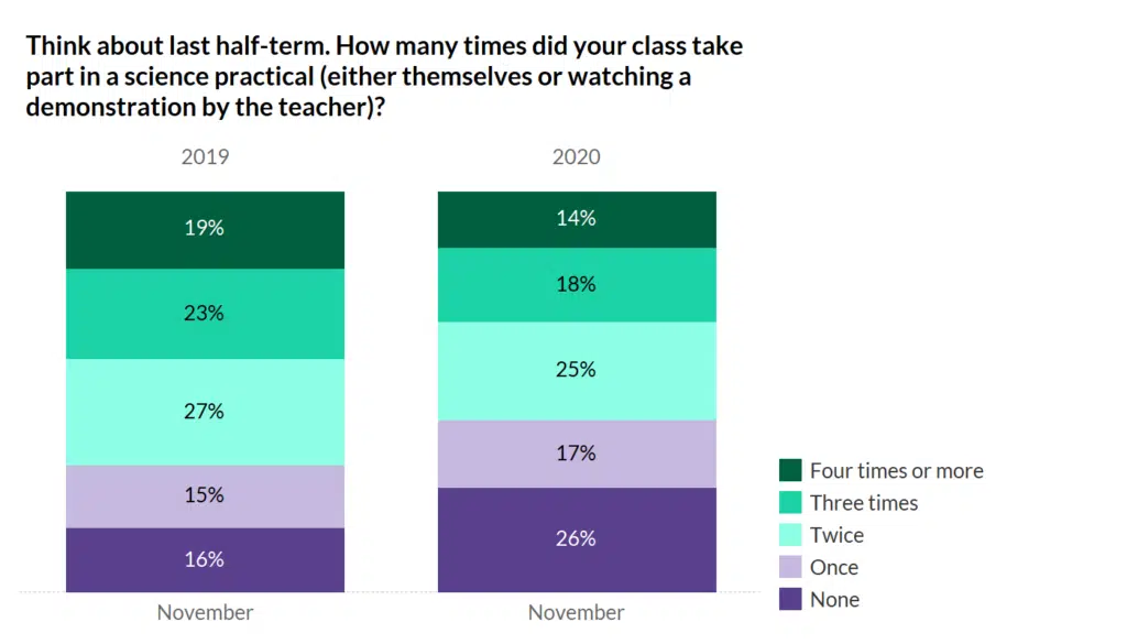 A year ago we also asked primary teachers about how the number of science experiments they had carried out with their class over the autumn half-term. Science experiments can be complicated to run, involving children moving around the classroom to access sinks and collect resources. Not surprisingly, there has been a big fall in primary science experiments – 26% of teachers said they had carried out none, versus 16% a year earlier.