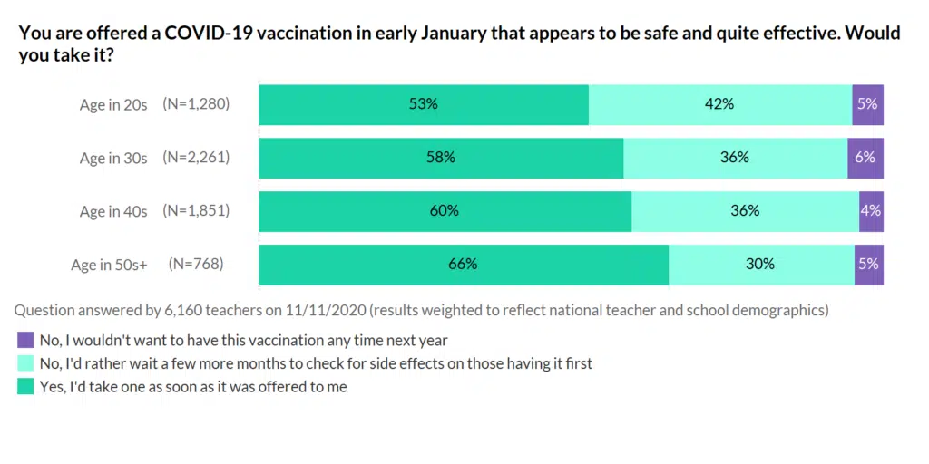 This doesn’t mean you don’t value vaccination programmes. Just 1-in-20 of you would not want to have a COVID-19 vaccination if available next year. Those aged 50 and over are most keen to be in the first tranche. Many more teachers in their 20s would rather wait to check it is safe before proceeding. This simply reflects the balance of risks. Most in their 20s perceive the risk of dying from COVID to be very low.