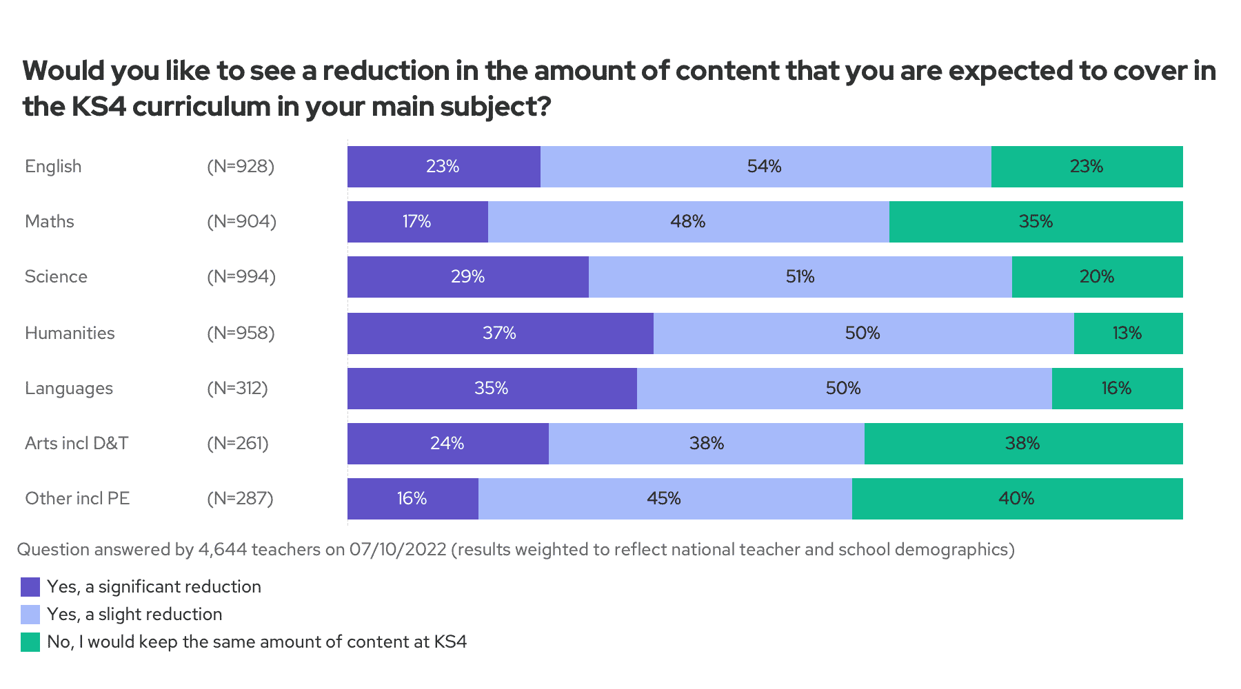 And no, Science teachers, we haven’t forgotten about you – although it’s slightly more challenging to tease apart this data. At first glance, however, teachers of all three sciences were in broad agreement, around 30% of Biology, Chemistry and Physics teachers wanted a significant reduction in content.