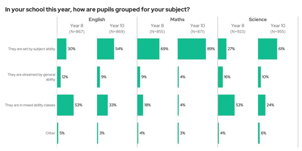 Across all Year 8 subjects, Maths remains is the only one where the majority of pupils are placed in subject ability sets. However, attainment setting rises as students move into the GCSE years, with 46% of teachers overall saying that pupils in their subject are set by subject ability. Even at that point, though, one-in-three English teachers say their students are still in mixed ability classes, as do one-in-four Science teachers.