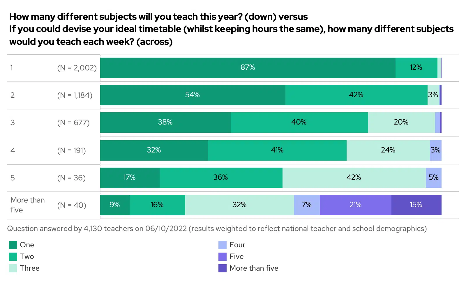 This won’t come as a huge surprise, but many people who say they are teaching lots of subjects want to teach fewer subjects! Not as much as you might think, though, as many teachers would only want to drop one or two of the subjects they teach! In fact, 13% of teachers who are only teaching one subject want to teach more subjects this year. They should be careful what they wish for though, as 54% of teachers who are teaching two subjects want to teach one!