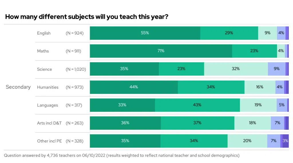 However, many Languages teachers buck that trend and don’t want to teach fewer – just 41% of Languages teachers said they’d ideally teach one subject. A similar theme emerged among Science teachers, 13% of whom said they would ideally teach all three sciences!