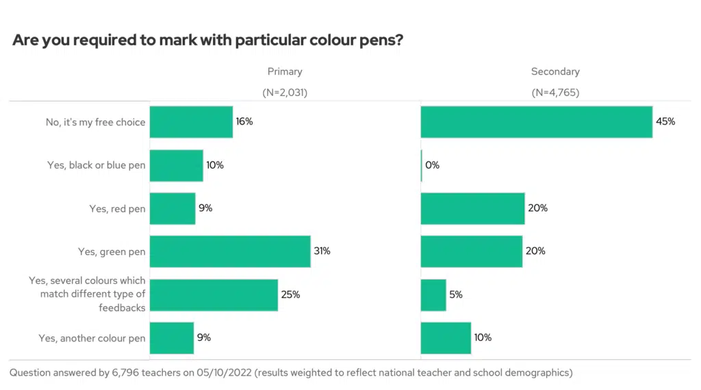 Just 16% of primary teachers say they have completely free rein to choose a pen for marking. 31% of primary teachers are required to use a green pen, but 25% say that they need to have several different colours depending on the feedback given – talk about workload! 🤯