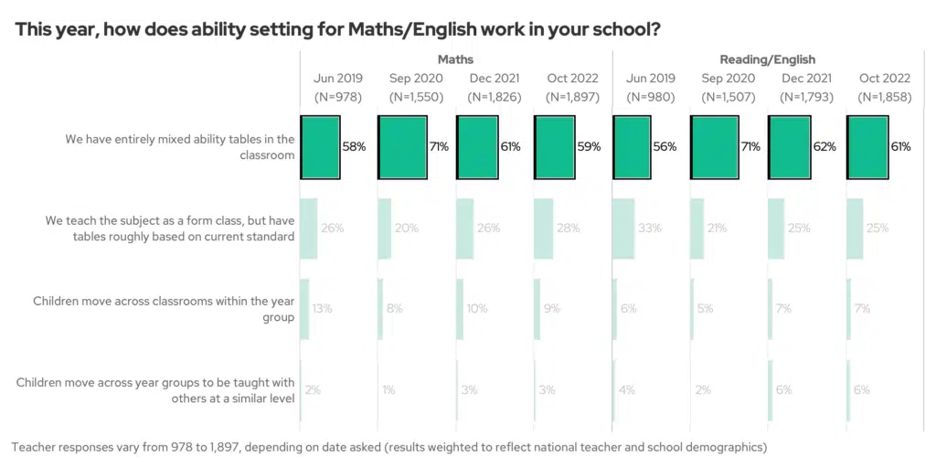 Grouping in primary schools looks very different, with the key question being how students are arranged on tables during maths and English/reading lessons. The pandemic saw a temporary increase in mixed ability grouping across tables in primary schools – in September 2020, over 70% said this was the case. It has since fallen again, back to a pre-pandemic norm of 60% of pupils on mixed-ability tables.