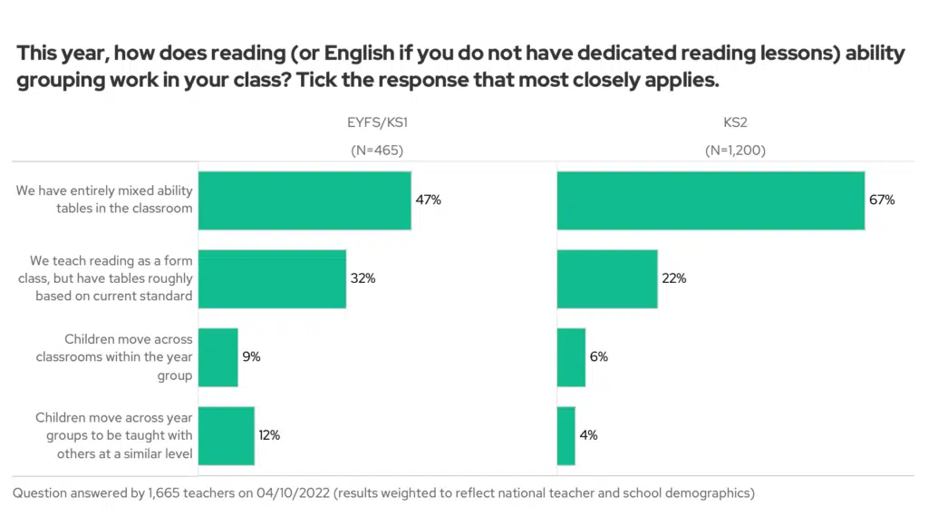 Maths grouping doesn’t vary much by Key Stage within primary schools, but things are very different for reading where phonics programmes usually require students to be grouped by their phonics stage. This means that in EYFS/KS1, less than half of reading instruction takes place on mixed reading attainment tables and 12% of students are even being moved across year groups to access reading instruction! By KS2, this has changed and two-thirds of reading/English classes use mixed attainment tables.