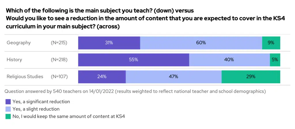 Indeed, the splitting proved fruitful, as History teachers were most likely of all teachers to want a significant reduction in the amount of KS4 content in their subject. A huge 55% of History teachers wanted this, compared to 31% of Geography teachers and 24% of RS teachers.