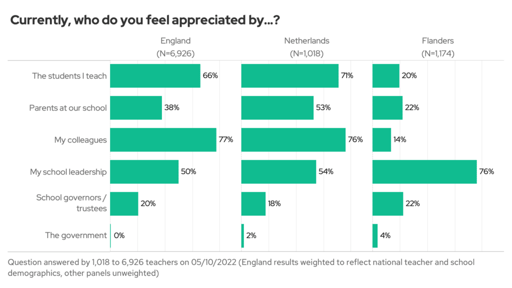 Perhaps unsurprisingly, the government didn’t fare well – but we’re not alone in not feeling appreciated by political leaders. While 0% of teachers in England said they felt appreciated by the government (although there were some), 2% of teachers in the Netherlands and 4% in Flanders felt the same!