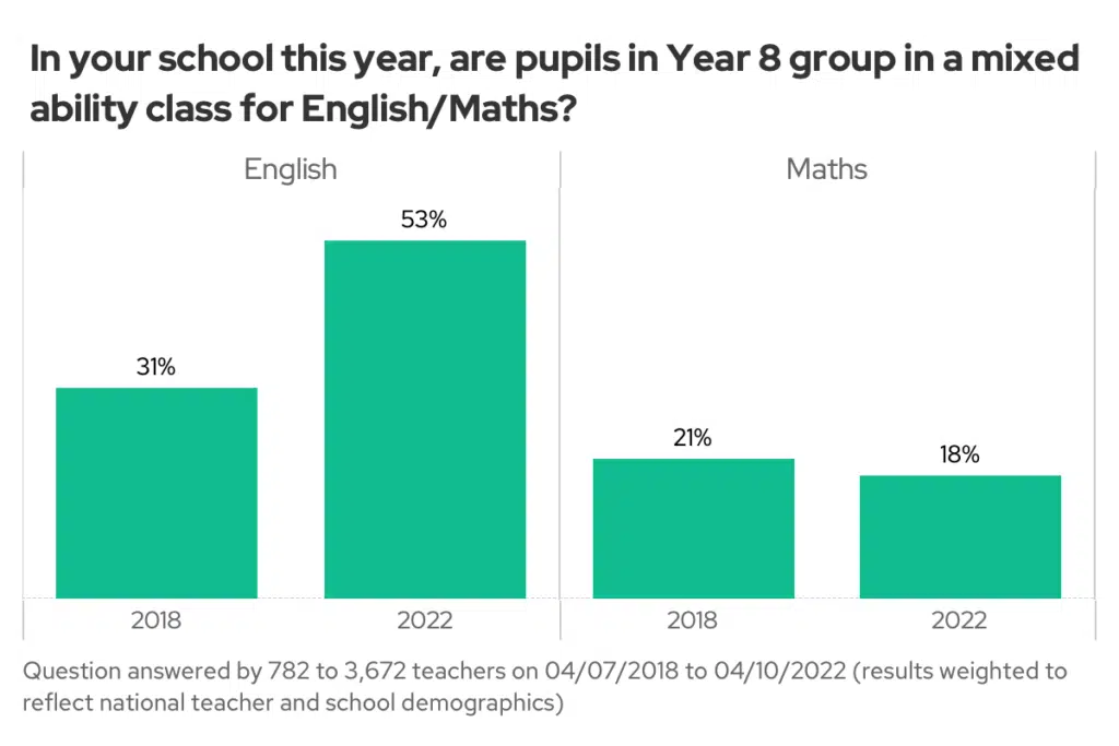 In Year 8, setting isn’t favoured by the majority of teachers. Just 30% of English teachers say their pupils are set in Year 8, far less than when we last asked in 2018, when it was 50%. However, the reverse is true for Maths teachers. In 2018, 65% of Maths teachers said they used ability setting, rising to 69% today.
