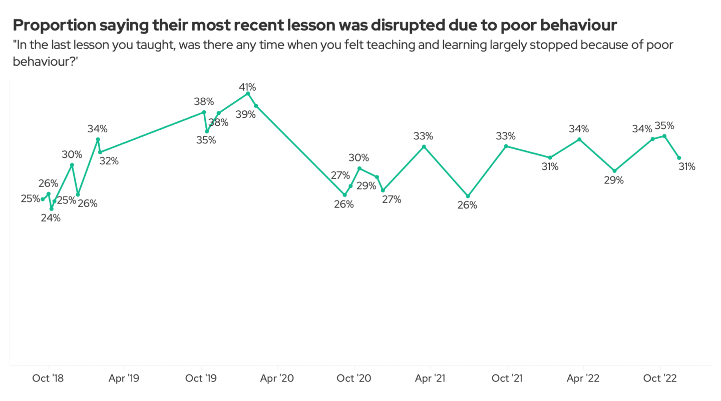 The pandemic appeared to ‘reset’ this disruption, with as few as 26% of you saying poor behaviour disrupted lessons when schools fully restarted in September 2020. However, as restrictions have eased further and time has passed, behaviour-related disruption has slowly, but steadily, risen.As restrictions eased and time passed, behaviour-related has been slowly, but steadily, rising since.