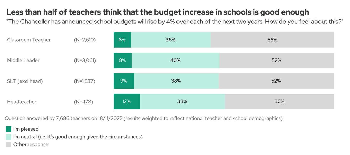 In November’s Budget, schools received a somewhat unexpected announcement – a 4% rise in their school’s budget for each of the next two years. It was a surprise, for sure, and responses were mixed! While around half of you thought that it was good enough given the circumstances, the same percentage were either disappointed or angry.
