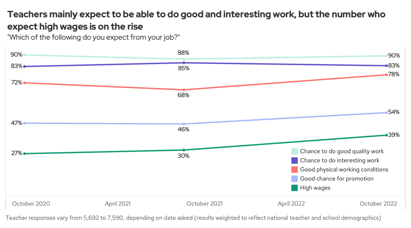 In other pay-related news, we asked what people expected from their job. Thanks to years of wage stagnation and real-terms cuts since 2010, 39% of teachers now say they expect high wages from the job – up from 30% when we asked in 2021. This was evenly spread across all seniorities.