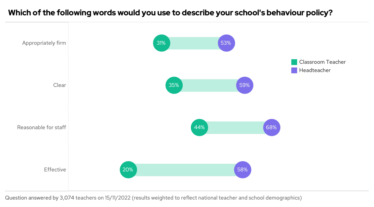 - Just 35% of classroom teachers think the behaviour policy is clear, compared to 59% of headteachers