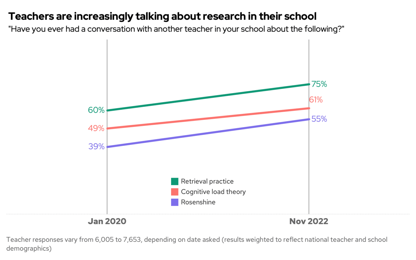 Now, we know you Tappers are a research-informed bunch, but it seems that over the past year you’ve been talking with you colleagues more and more about research! When we first asked in 2020, 60% of you said that you’d have a conversation with a colleague about retrieval practice and now, in 2022 this is 75%. All of the other options also saw an increase, Rosenshine’s Principles of Instruction was also a big mover, going from 39% to 55%.