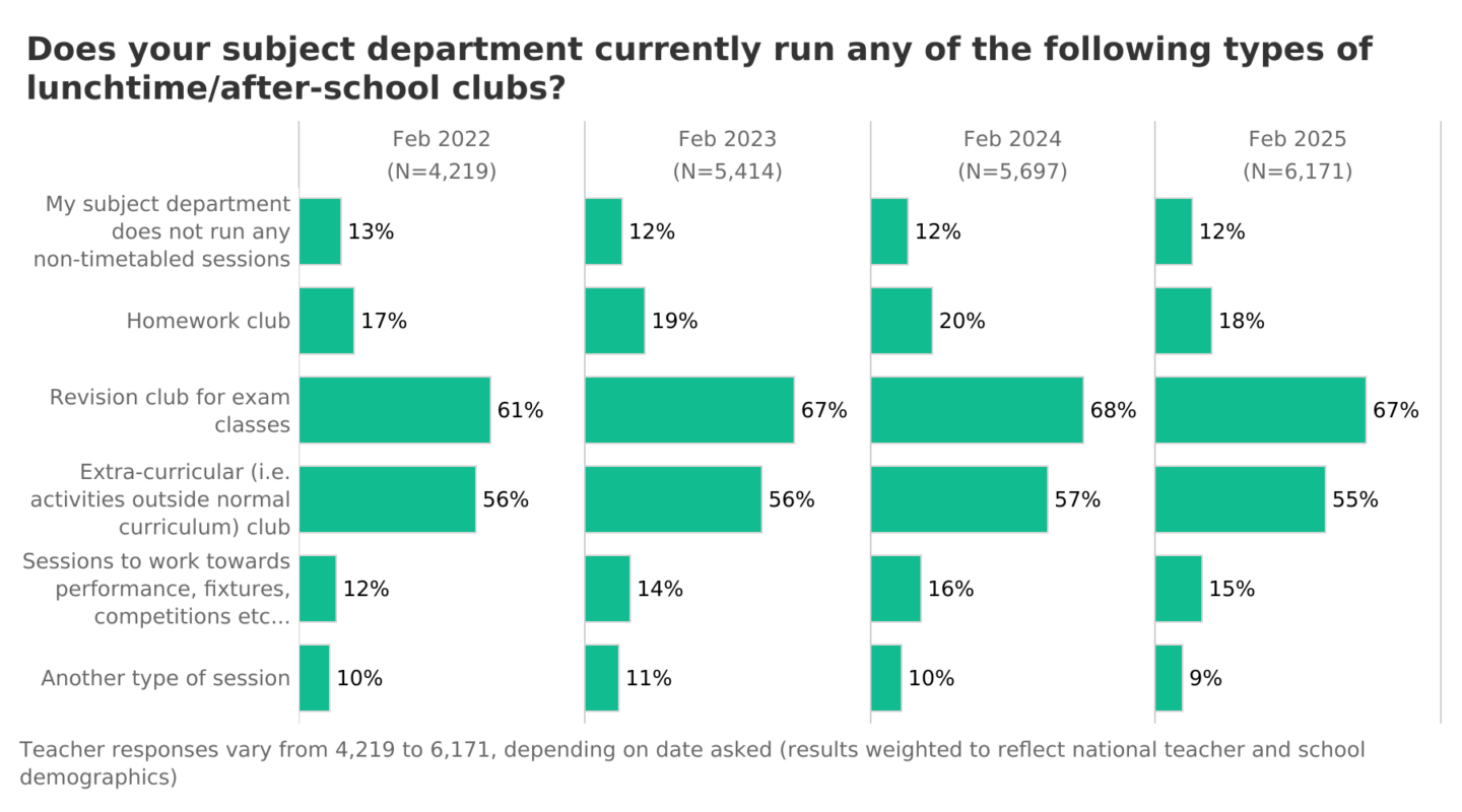 One reason for offering the flexibility around PPA is because of the extra hours teachers put in when running lunchtime or afterschool clubs. A huge 88% of teachers say their department offers extra-curricular clubs, with just 12% reporting there were no non-timetabled sessions. Over time, running extra clubs has remained pretty stable – with small increases in the numbers offering revision clubs for exams (67% UP from 61% in 2022).