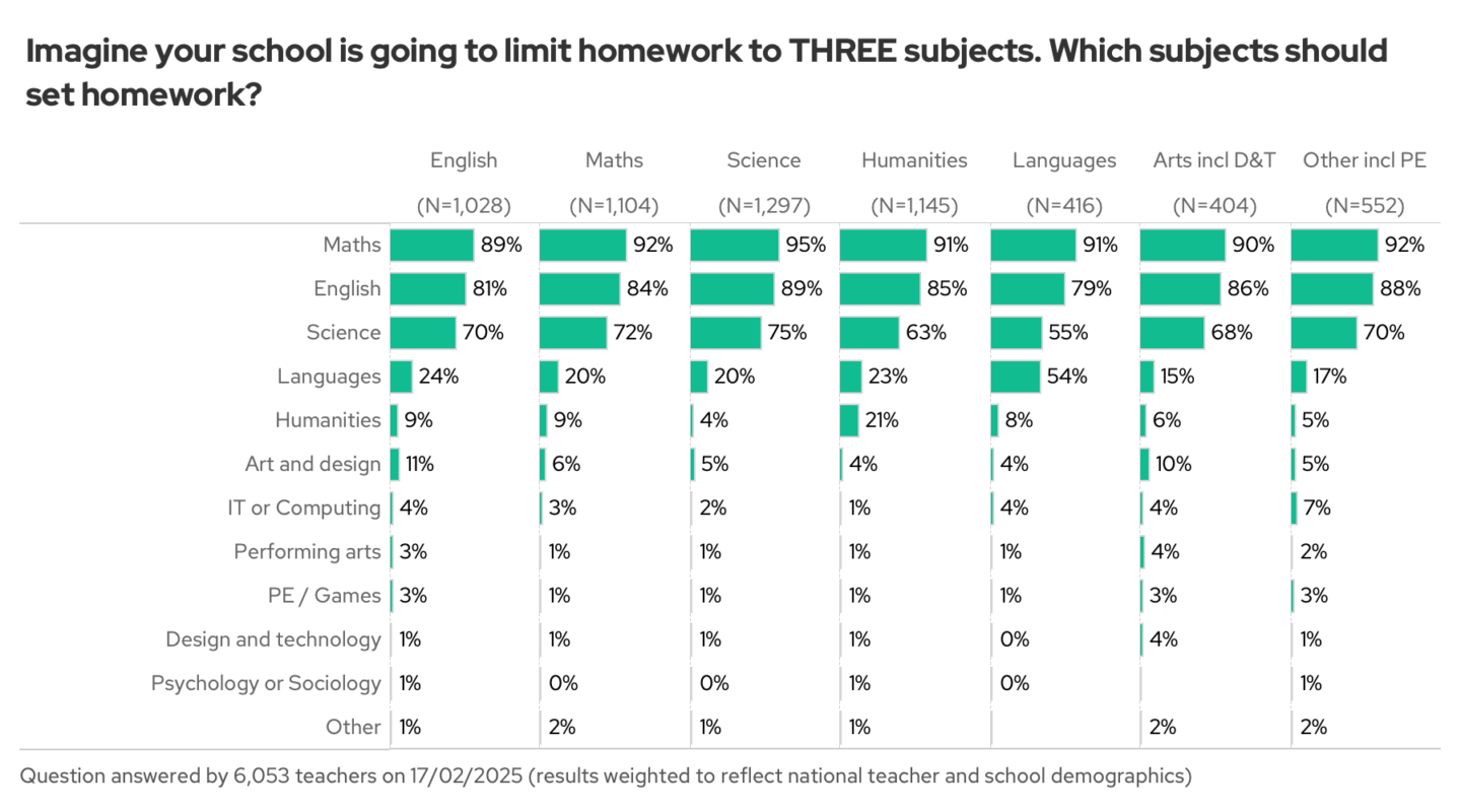 Teachers in all subjects thought that Maths should be one of the three subjects chosen, with 92% of you choosing it. Intriguingly, more Science teachers (95%) than Mathematics teachers (92%) emphasise the importance of Maths homework. English and Science follow closely, with Languages ranking fourth; one in five teachers believe it should be among the top three subjects assigned homework in this context.