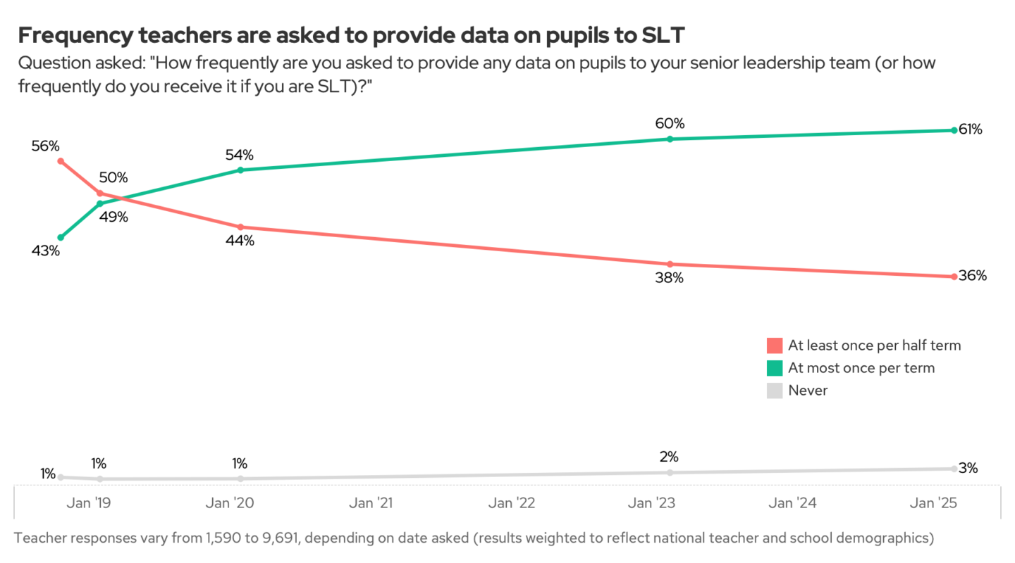 A significant portion of these tasks involves data analysis and submissions, commonly known as ‘data drops.’ Interestingly, only 2% of teachers consider this their favourite aspect of the job. Currently, approximately 36% of you are required to provide pupil data to the Senior Leadership Team (SLT) at least once per half term—a reduction of fourteen percentage points since 2019.