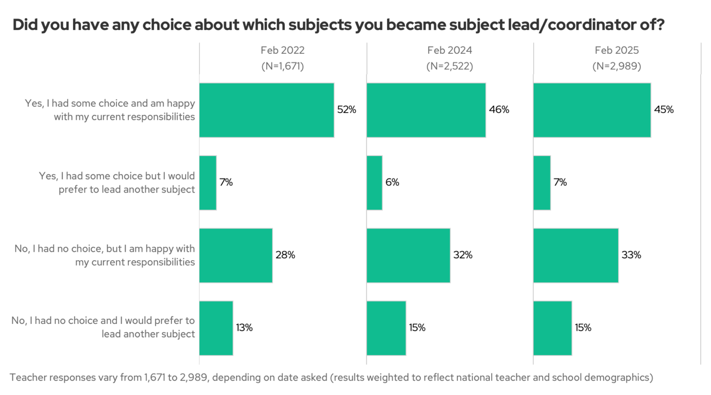 Not having a choice is a common set up, with just under half saying they had NO choice in what subjects they were made subject leader for (48%).
