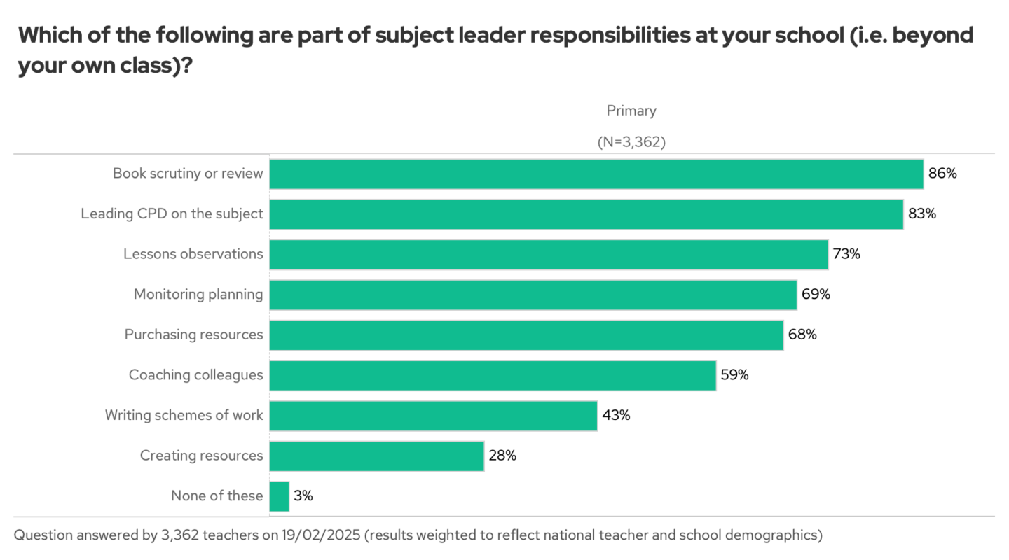 Over in primary, the issue of subject leadership continues to prove tricky for some teachers – with the subject responsibility given to them despite the preferences of that teacher.