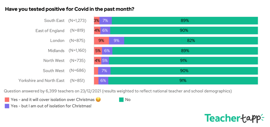 Sadly, 4% of you had to isolate over Christmas due to a positive Covid test 😔. In step with the rest of the population, Londoners were most affected by the Omicron surge, with 9% of teachers isolating on Christmas Day. A further 9% of Londoners had tested positive at some point in the prior month but managed to avoid isolating on Christmas Day.
