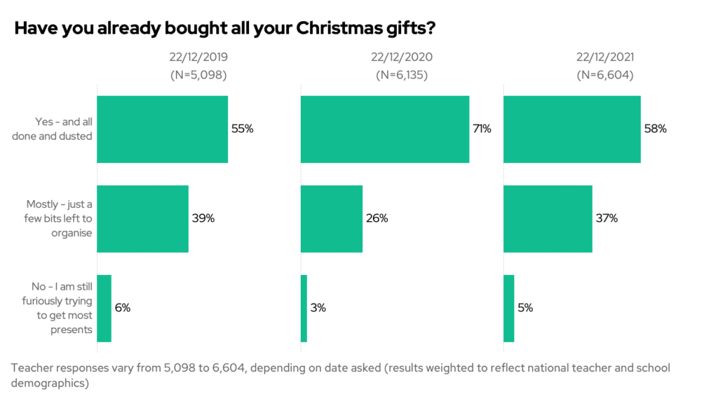Last year, you were more organised than ever buying all of your Christmas gifts. In 2020, 71% of teachers were done and dusted with buying on 22nd December. In 2019, the number was only 55%. Would the organisational skills stick?