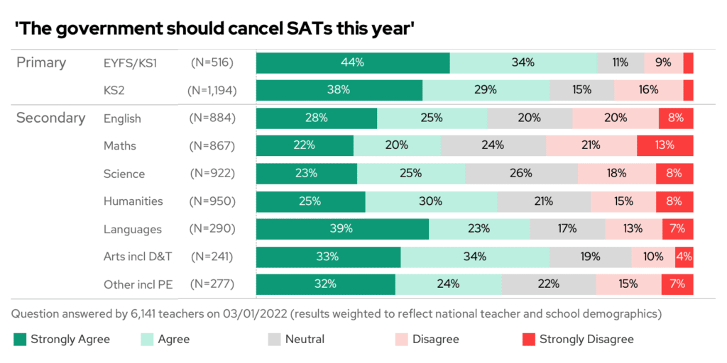 In all fairness, the result isn’t entirely pandemic related. Many of you have called for the cancellation of SATs for a while. Once again, secondary maths and science teachers are least in favour of cancelling SATs, being the only subjects where less than 50% of teachers wanted SATs cancelled.