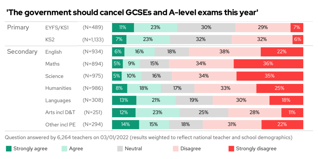 Maths and Science teachers, as ever, are the most in favour of exams, with only 15% of these thinking they should be cancelled.